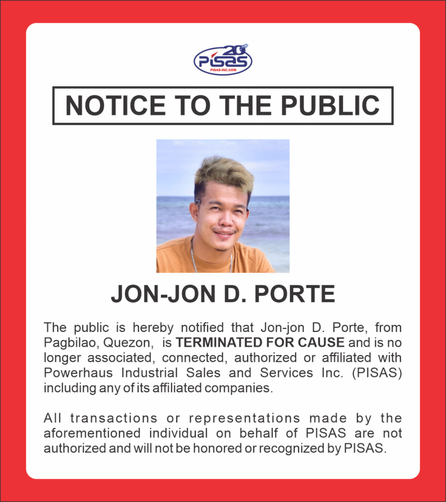 The public is hereby notified that JON-JON D. PORTE, from Pagbilao, Quezon, is TERMINATED FOR CAUSE and is no longer associated, connected or affiliated with Powerhaus Industrial Sales and Services, Inc. (PISAS) including any of its affiliated companies.